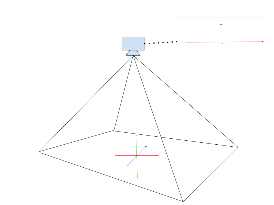 이 좌표 공간은 월드 공간 좌표 체계와 동일한 씬을 담는다. 하지만 렌더링의 시발점인 카메라의 시점으로 씬을 담는다.