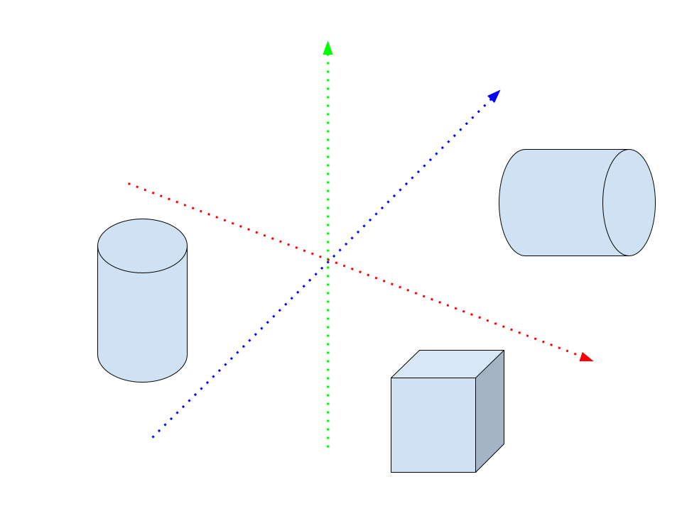 객체 공간은 3D 좌표체계로 원점은 주로 입력 조립 단계에서 렌더링 파이프라인으로 보낼 메시의 아래쪽이나 중앙으로 잡혀 있다.
