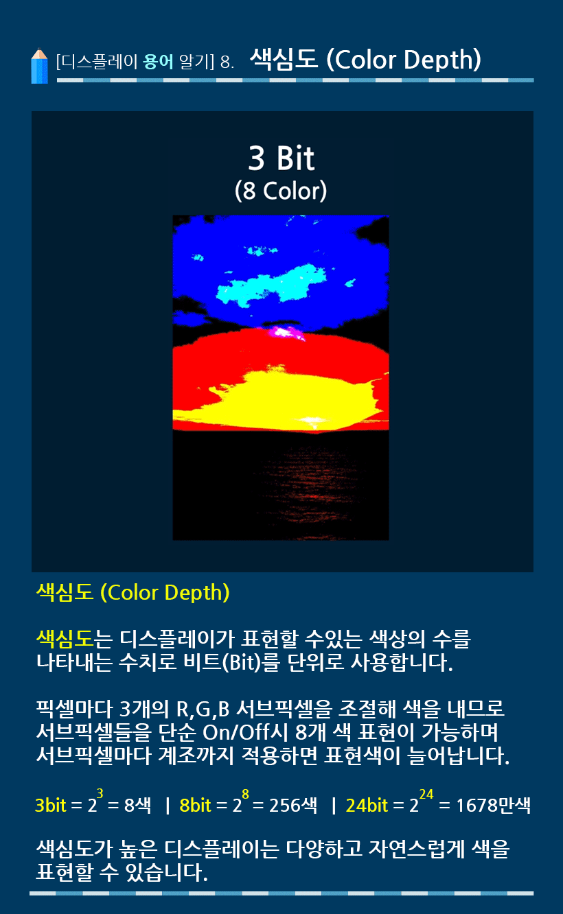디스플레이에서 색심도(色深度, Color Depth)란 디스플레이가 표현할 수 있는 색의 가짓수를 의미합니다. 일반적으로 디스플레이는 R, G, B 색을 내는 서브픽셀(Sub-pixel)의 조합을 통해 색을 내는데 R, G, B의 배합과 R, G, B 각각의 밝고 어두운 정도(계조)를 조절해 다양한 색상을 표현할 수 있습니다. 색심도가 높을수록 더욱 풍부한 색 표현이 가능합니다.