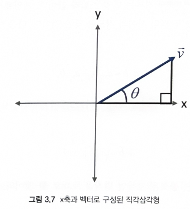 이제 액터의 새로운 전방 벡터로부터 회전 멤버 변수에 해당하는 각도를 구한다고 가정해본다. 이 경우에는 그림 3.7처럼 새로운 전방 벡터 v와 x축으로 직각 삼각형을 구성하면 된다. 이 삼각형에서 전방 벡터의 x요소는 삼각형의 밑변의 길이다. 그리고 전방 벡터의 y요소는 삼각형 높이다. 이 요소들의 비율값을 이용하면 아크 탄젠트 함수를 사용해서 각도 세타를 계산하는 것이 가능하다.