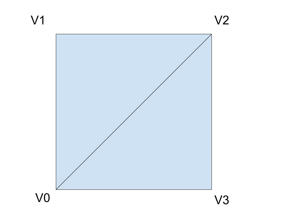 예를 들어 사각형을 만들기 위해서는 다음 그림에 보이는 것처럼 두 개의 삼각형으로 나누고 각각의 삼각형을 구성하는 버텍스를 지정해야 한다.