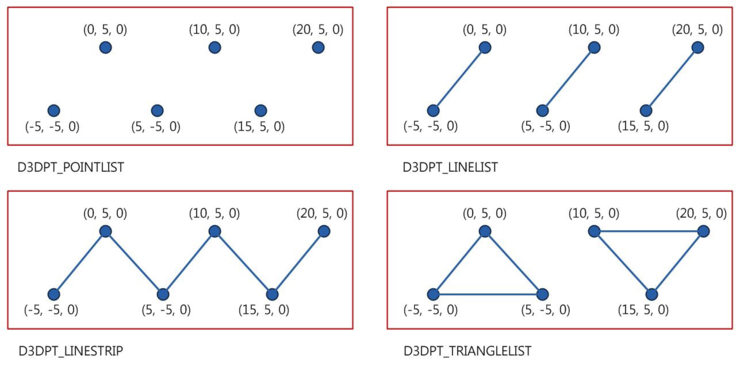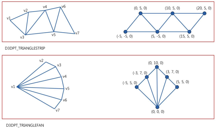 DrawPrimitive() 함수는 다양한 변종이 있는데, DrawIndexedPrimitive(),DrawPrimitiveUP(),DrawIndexedPrimitiveUP() 등이 있다. 이중에서 실제 게임개발에 가장 많이 사용되는 함수는 DrawIndexedPrimitive()와 DrawIndexedPrimitiveUP()함 수로 인덱스를 가진 함수들이다. (이 중에서 DrawIndexedPrimitive()의 속도가 가장 빠름)
