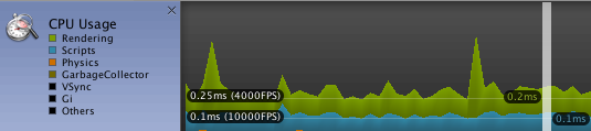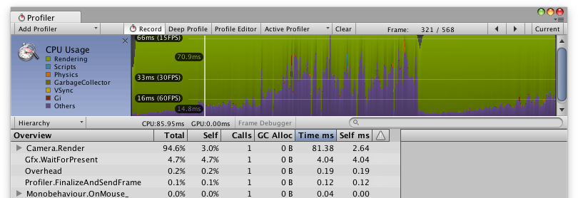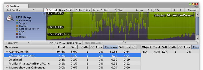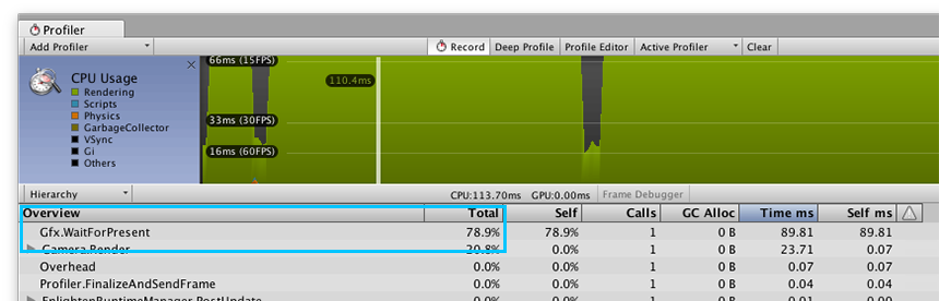 Gfx.WaitForPresent 함수가 CPU 사용량 프로파일러에서 가장 오래 걸리는 경우 CPU가 GPU를 기다리고 있음을 나타냅니다. 이것은 우리 게임이 이 시점에서 GPU 바운드임을 의미합니다.