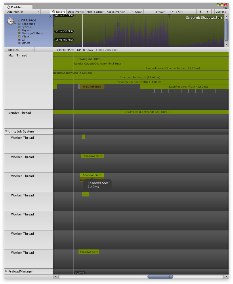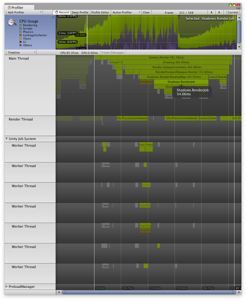 타임라인 보기를 확대하여 개별 작업을 자세히 볼 수 있습니다. 다른 함수에 의해 호출된 함수는 바로 아래에 표시됩니다. 이 예에서는 이 작업을 구성하는 개별 작업을 보기 위해 Shadows.RenderJob을 확대했습니다. Shadows.RenderJob이 메인 스레드에서 발생하는 함수를 호출하는 것을 볼 수 있습니다. 그림자와 관련된 작업을 수행하는 작업자 스레드도 볼 수 있습니다. 기본 스레드에 WaitingForJob이라는 작업이 있다는 것은 기본 스레드가 작업자 스레드가 작업을 완료하기를 기다리고 있음을 나타냅니다. 이로부터 그림자와 관련된 렌더링 작업이 메인 스레드와 작업자 스레드에서 너무 오래 걸린다는 결론을 내릴 수 있습니다. 우리는 이제 우리의 문제에 대해 많이 알고 있습니다!
