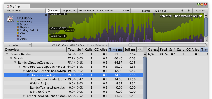 이 경우 Camera.Render 내에서 가장 비용이 많이 드는 함수가 Shadows.RenderJob이라는 함수와 관련되어 있음을 알 수 있습니다. 이 특정 기능에 대해 아직 많이 알지 못하더라도 문제에 대한 정보는 이미 많이 있습니다. 우리의 문제는 렌더링과 관련되어 있으며 이 시점에서 발생하는 가장 비용이 많이 드는 작업은 그림자와 관련이 있다는 것을 알고 있습니다.