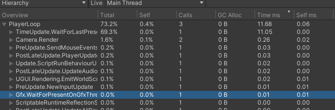 Hierarchy 뷰에서 WaitForTargetFPS라는 함수를 볼 때마다 이는 게임이 VSync를 기다리고 있음을 의미합니다. 이 기능을 조사할 필요가 없으며 무시해도 됩니다.