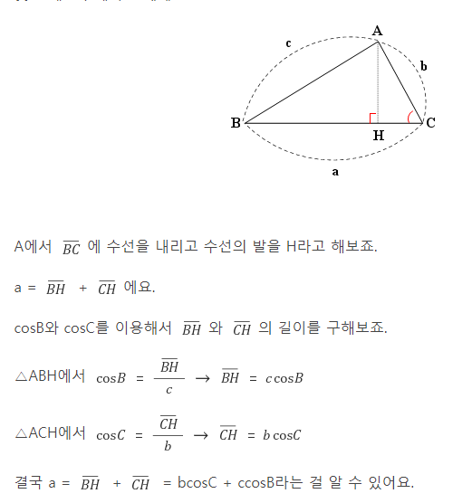 사인법칙에 이어 코사인법칙이에요. 코사인법칙은 두 개가 있는데 이 글에서는 제1 코사인법칙에 대해서 알아볼 거예요. 제1 코사인법칙은 그리 많이 사용하는 법칙은 아니에요. 그렇다고 전혀