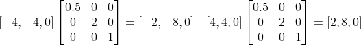 최솟점(-4,-4,0)과 최댓점 (4,4,0)으로 정의된 사각형을 z축은 그대로 두고 x축으로 0.5단위, y축으로 2단위 비례해 보자. 해당 비례행렬은 다음과 같다.