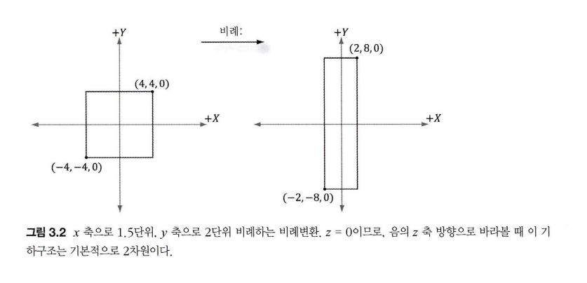 비례(scaling:확대.축소) 변환은 물체의 크기를 바꾸는 효과를 낸다. [그림 3.1]에 비례변환의 예가 나와 있다. 비례변환은 다음과 같이 정의된다.
