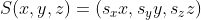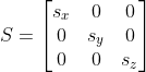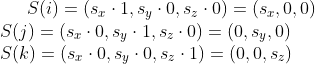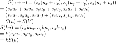 이 변환은 현재 좌표계를 기준으로 하여 벡터를 x 축으로 s_{x} 단위, y 축으로 s_{y} 단위, 그리고 z 축으로 s_{z}단위만큼 비례한다. 그럼 이 S가 실제로 하나의 선형변환임을 증명해 보자. 다음이 성립한다.