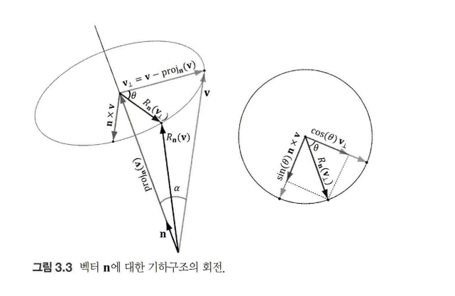 이번 절에서는 [그림3.3]에서처럼 벡터 v를 축 n에 대해 회전하는 변환을 살펴본다. 이러한 변환에서 회전각은 n을 내려다보는 방향(즉, n의 반대 방향)을 기준으로 시계방향으로 측정한다. 또한, ||n|| = 1 이라고 가정한다.