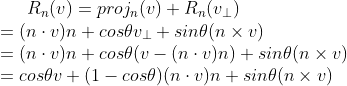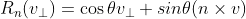 을 구하기 위해, 회전 평면에 하나의 2차원 좌표계를 설정한다. v_{\perp}를 두 기준 벡터(reference vector)중 하나로 사용한다. 다른 하나는 v_{\perp} 와 n에 수직인 벡터이어야 한다. 그러한 벡터는 외적 n x v (왼손 엄지 법칙)로 구하면 된다.